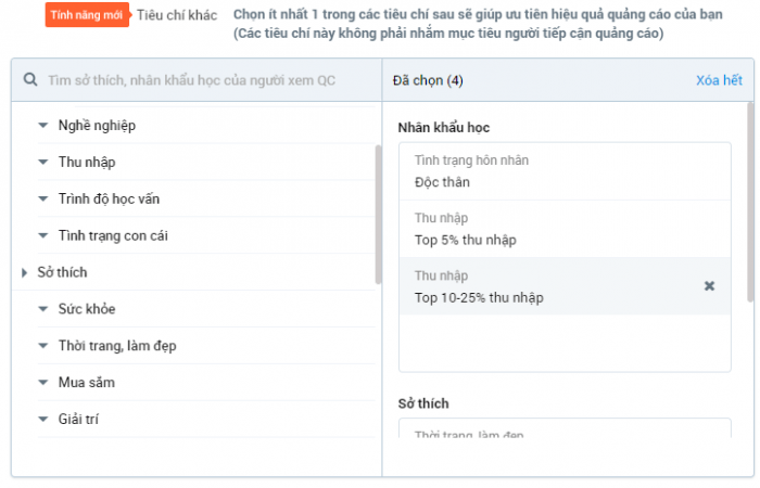 5. Tiêu chí khác (Nhân khẩu học và Sở thích): nhà quảng cáo chọn thông tin nhân khẩu học và sở thích dựa trên đặc điểm của khách hàng tiềm năng. Hệ thống Zalo Ads sẽ ưu tiên phân phối quảng cáo đến nhóm người dùng có trùng nhóm tiêu chí này.